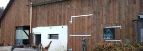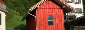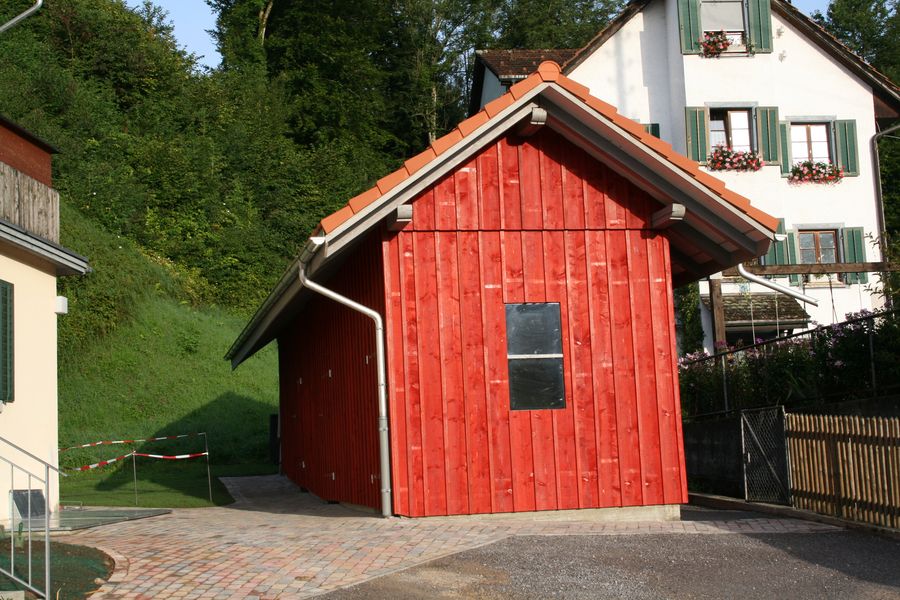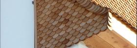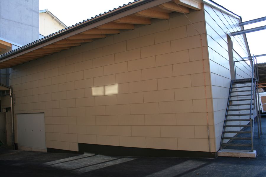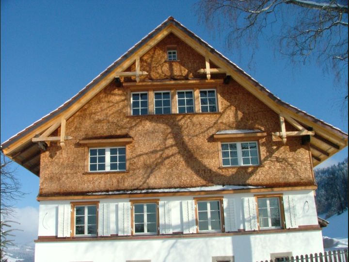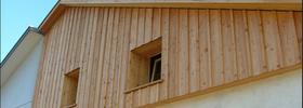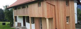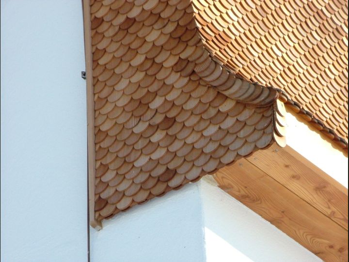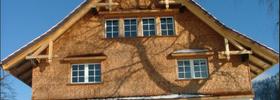 Ähnlich wie das Steildach hat auch die Fassadenbekleidung einen mehrschichtigen Aufbau mit Dampfbremse, Dämmung, Windpapier, Hinterlüftung, Montagelattung und Wetterschutzschicht.